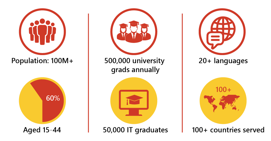 Every year, the country has about 500,000 graduates from over 100 institutes and 50 universities, with about 220,000 students in service-related fields, 50,000 of which are in IT-related fields. Most of these graduates are ready to engage in advanced processes and provide knowledge services in over 20 languages. This puts Egypt shoulder-to-shoulder with Poland and the Philippines as a strong outsourcing destination.